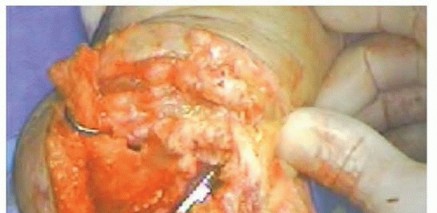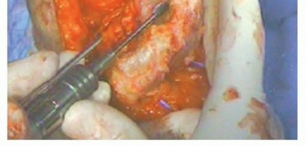 TECH FIG 3 • Entry into the medullary canal of the ulna is gained with a high-speed burr hole through the distal articular surface of the sigmoid notch.