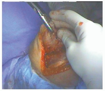 FIG 2 • Triceps-splitting approach: The triceps is split sharply in the midline to the olecranon process where it may be partially detached medially and laterally.