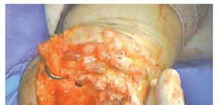 TECH FIG 1 • After skeletonizing, the distal humerus entry into the medullary canal is gained with a rongeur, removing bone from the articular surface in line with the midpoint of the olecranon fossa.