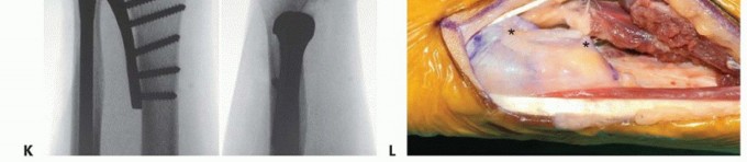 TECH FIG 1 •(continued)C. Longitudinal dorsal incision made to expose ulnar head and elevate ulnar-based flap of capsule. D. Reflected extensor retinaculum with preserved ECU. E. Resected ulnar head measured to match partial ulnar head prosthesis. F,G. Intraoperative Fluoroscan demonstrating partial ulnar head resection. H,I. Intraoperative Fluoroscan images following placement of implant and soft tissue used to stabilize the prosthesis during closure. J. The ulnar medullary canal is reamed. K,L. Postoperative radiographs of partial ulnar head prosthesis.