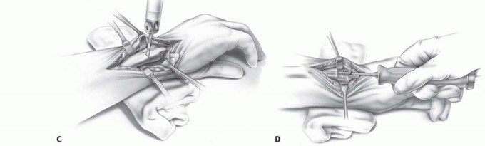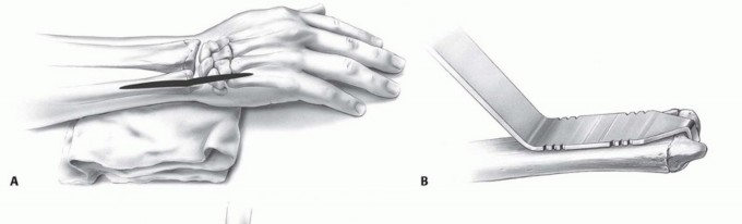 An incision is made along the ulnar border of the shaft of the distal ulna in line with the ulnar styloid. The interval between the flexor carpi ulnaris (FCU) and extensor carpi ulnaris (ECU) tendons is developed for access to the ulna.A dorsal approach is an alternative and is indicated for partial head replacement. Access to the articular portion of the ulnar head is gained through the floor of the fifth extensor compartment.