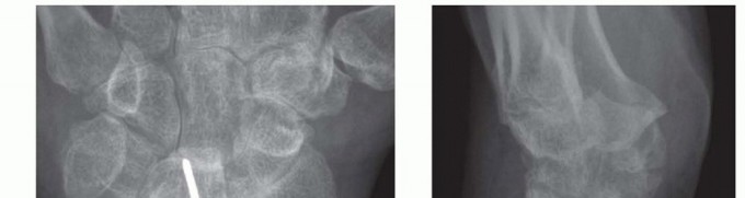 TECH FIG 1 • A,B. Preoperative radiographs of a patient with rheumatoid arthritis and previous radiolunate fusion who treat with First Choice partial ulnar head arthroplasty (Integra LifeSciences, Plainsboro, NJ).(continued)
