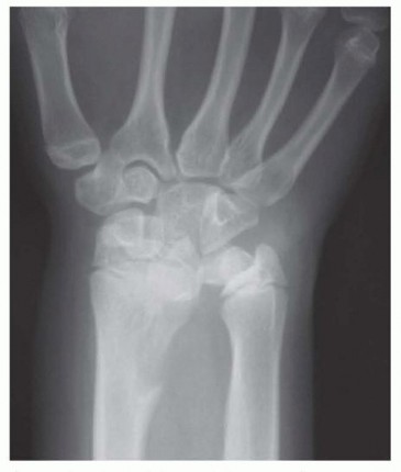 FIG 2 • Radiograph of Madelung deformity showing congenital ulnar positive variance. P.1047Analysis of whether the pain was caused by an acute injury or brought on by repetitive motion activitiesA distal radius or radial head fracture can lead to ulnocarpal impaction, as can a chronic distal radius physeal injury (ie, the gymnast’s wrist).Characterization of the painDescription of the location, duration, and radiation of the pain as well as any associated swelling, burning or tingling sensations, or sounds (clicks, etc.)Aggravating and alleviating factorsThe physical examination should always begin with inspection.The wrist and elbow should be examined for surgical scars.Prominence of the ulna either palmarly or dorsally may indicate instability of the DRUJ. A palmar sag and a supination posture of the wrist may indicate the capsuloligamentous instability that occurs in rheumatoid arthritis.Swelling, bruising, perforations of the skin, or obvious dislocations may indicate trauma. Intrinsic atrophy and clawing may indicate ulnar nerve pathology.Splinter hemorrhages beneath the nails and decreased turgor in the volar digital pads suggest vascular insufficiency.Single-finger palpation should proceed in a systematic fashion by isolating anatomic structures. The examination should be performed with the patient’s elbow resting on a table, the hand pointing toward the ceiling, and the forearm in a neutral position.Tenderness over any anatomic structure suggests a specific clinical diagnosis.Active and passive range-of-motion (ROM) maneuvers may illicit pain, suggesting pathology. Limitations of ROM may be the result of swelling or obstruction (blocking). The examiner should listen for sounds of pathology throughout ROM.Specific provocative tests should be performed in an attempt to further define the injured structure(s).Piano key test: A positive result is characterized by painful laxity in the affected wrist compared with the contralateral wrist, suggesting DRUJ synovitis.Ulnar compression test: A positive test is exacerbation of pain, which suggests arthritis or instability; dorsal or palmar subluxation may be noted.Lunotriquetral ballottement test: Used to elicit laxity associated with pain and crepitus in the presence of lunotriquetral instabilityReagan shuck test: Positive if pain and clicking at the lunotriquetral joint is present, suggesting lunotriquetral ligament perforation or disruption
