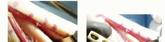 An 8- to 10-cm midaxial incision is made over the distal third of the ulnar diaphysis, ending at, or just proximal to, the distal ulnar metaphysis.The interval between the ECU and the flexor carpi ulnaris is developed to expose the ulnar periosteum.Although it is unlikely to be encountered, the location of the dorsal sensory branch of the ulnar nerve must be considered and protected.It takes off from the ulnar nerve an average of 6.4 cm proximal to the distal aspect of the head of the ulna and runs along the subcutaneous border of the ulna for about 5 cm proximal to the pisiform.The dorsal sensory branch typically courses along the medial border of the ulnar head with the forearm supinated and runs in a more palmar position with the forearm pronated.2Circumferential subperiosteal dissection is avoided to prevent injury to the segmental blood supply to the distal ulnar diaphysis, with the exception of a 1-cm zone at the site of the planned osteotomy.26