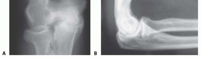 Anteroposterior (AP), lateral, and oblique radiographs (FIG 1) are diagnostic and illustrate characteristic features of the condition.The AP view should be taken with the beam perpendicular to the distal humerus for distal humerus pathology and perpendicular to the radial head for proximal forearm pathology. These views will show ossification and osteophyte formation of the olecranon and coronoid fossae.The lateral view should be taken in 90 degrees of flexion with the forearm in neutral rotation. This view will show an anterior osteophyte on the coronoid fossa and process and a posterior osteophyte on the olecranon fossa and process.The lateral oblique view provides better visualization of the radiocapitellar joint, medial epicondyle, and radioulnar joint.The medial oblique view provides better visualization of the trochlea, olecranon fossa, and coronoid tip. A cubital tunnel view may be useful if there is ulnar nerve symptomatology.Computed tomography or a lateral tomogram are helpful for preoperative planning to assess the presence and location of loose bodies and subtle osteophyte formation (especially in earlier stages).