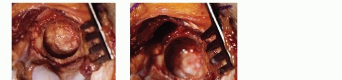 TECH FIG 2 • A neurosurgical dowel is used to make a hole and remove the ossified olecranon fossa. Care should be taken for proper placement of the foraminectomy. The dowel should follow the curvature of the trochlea.