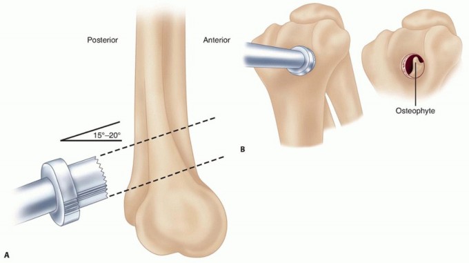 TECH FIG 3 • A,B. Once the foraminectomy is completed, the core of bone is removed from the distal humerus. This allows access to the anterior elbow compartment and to the coronoid. At this time, loose bodies of the anterior compartment may be identified and removed. C. With maximum elbow flexion, the anterior osteophyte from the coronoid process is removed, using a curved osteotome. D. An instrument is then introduced through the foramen, and the osteophyte and a portion of the coronoid are removed. Occasionally, it is necessary to strip the anterior capsule from the anterior humerus using a blunt periosteal elevator to restore extension.Care must be taken to ensure that no osteophytes or loose bodies are overlooked.Bone wax is used to cover the margins of the foramen, and Gelfoam is inserted into the defect to fill the dead space.The wound is meticulously irrigated and closed in standard fashion. The elbow is carefully manipulated to maximize the total arc of motion.P.9153. Arthroscopic Ulnohumeral ArthroplastyThe elbow joint is insufflated with 15 to 20 mL of normal saline to distend the capsule of the joint.An anterolateral portal is established proximally to radiocapitellar joint and anteriorly to the lateral supracondylar ridge of the distal humerus.The arthroscope is introduced through the anterolateral portal allowing visualization of any pathologic structures of the anterior compartment of the joint and then an anteromedial portal is established.Removal of loose bodies and débridement of the anterior aspect of the elbow can be performed using an arthroscopic grasper and an arthroscopic shaver.The posterior aspect of the elbow is then palpated, and a standard posterolateral and posterior central portal are established.Débridement of spurs from the olecranon fossa and removal of loose bodies of the posterior aspect of the elbow can be performed through the posterior central portal.A 3.2-mm drill is then inserted through the posterior central portal into the center of the olecranon fossa and is angled toward to the center of the coronoid fossa. A drill hole is then developed from posterior to anterior to fenestrate the olecranon fossa.Under arthroscopic visualization through the anterolateral portal, the drill hole is enlarged in diameter to at least 1 cm using progressively larger drill bits.Once the foraminectomy of the olecranon fossa is complete, removal of the osteophyte from the coronoid process can be performed with maximum elbow flexion using an arthroscopic burr.All incisions are closed in standard fashion.