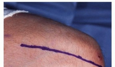 FIG 2 • With the patient in the lateral decubitus position, the elbow is flexed at 90 degrees and is resting on pillows (authors' preferred method). A posterior approach is used via a longitudinal skin incision, which extends distally about 4 cm and proximally 6 to 8 cm from the tip of the olecranon. Note the marked medial epicondyle. P.913