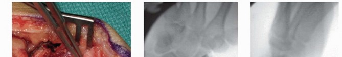 TECH FIG 3 • The scaphoid joysticks are used to reduce the fracture, and the length is estimated to determine the size of the volar wedge graft.