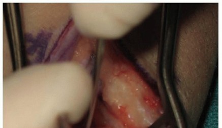 Rather than obtaining bone graft from the distal radius, a standard technique of harvesting bone from the iliac crest may be used.16,20A 2- to 3-cm incision is made just inferior to the superior border of the iliac crest just posterior to the anterior superior iliac spine (ASIS).The incision is kept below the belt line to minimize postoperative incisional tenderness.The incision is posterior to the ASIS to avoid iatrogenic nerve injury and subsequent numbness and painover the proximal lateral thigh.Dissection is accomplished using cautery through the deep fascia down to the crest. The superior crest is exposed and muscles are released from a portion of the outer table using cautery and an elevator.A water-cooled sagittal saw and a curved osteotome are used to harvest a bicortical segment of corticocancellous graft.The graft is slightly larger than the measured defect in the scaphoid. The inner table is left intact.The harvested outer table will be volar when the graft is placed in the scaphoid and the superior crest will be radial.A curette is used to harvest cancellous bone graft.The wound is copiously irrigated and temporarily packed with thrombin-soaked Gelfoam while attention is redirected to the scaphoid.After the scaphoid is reconstructed, the Gelfoam is removed and the wound is again irrigated. If indicated, a small suction drain is placed below the fascia.The wound is closed in layers with a running locking stitch used for the fascia.A local anesthetic with epinephrine may be injected before harvest of the graft or after closure.