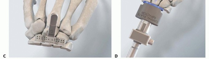 Strict elevation and early active digital range of motion are encouraged.At 2 weeks postoperatively, the sutures are removed. Implant reduction is confirmed by x-ray and gentle wrist exercises are begun, including active flexion, extension, radial and ulnar deviation, and pronation and supination. A removable splint is applied.The splint is weaned at 4 weeks postoperatively, and strengthening is added to the rehabilitation. The patient is advised against impact loading of the wrist and repetitive forceful use of the hand.
