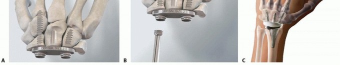 TECH FIG 5 • A. Impact the carpal component and insert the fixation screws, beginning with the radial screw using the modular drill guide, guidewire, and cannulated drill for preparation. B. Apply the locking caps over radial and ulnar carpal screws. C. Impact the radial component, apply the appropriate poly bearing, reduce the joint, and assess range of motion and joint stability. Drill to the proper depth with a cannulated drill bit and insert a 4.5-mm screw of the measured depth.Using a similar technique for the ulnar screw, position the modular drill guide barrel in the ulnar hole of the carpal component and its saddle on the fourth metacarpal shaft. Insert a guidewire, measure, anddrill. Insert a screw of proper length. Do not penetrate the fourth CMC joint (TECH FIG 5A). Apply locking caps over the two carpal screw heads (TECH FIG 5B).Confirm appropriate carpal poly thickness using carpal poly trials.Apply the carpal poly implant and impact it into place, ensuring there is no impinging soft tissue. Reduce the joint and make a final assessment of the balance and stability (TECH FIG 5C).7. Bone Graft and ClosureP.1005Perform an intercarpal fusion by carefully resecting portions of the joint surfaces and then inserting cancellous bone chips from the previously resected bone into the prepared fusion sites.Reattach the dorsal capsule to the dorsal rim of the radius using the previously placed sutures. The medial and lateral edges of the capsule are also closed.If the capsule is insufficient for closure with the wrist flexed 30 degrees, it is supplemented with a portion of the extensor retinaculum.A suction drain is placed, skin is closed, and a bulky dressing with a below-elbow plaster splint is applied.Indications1. Wrist degeneration resulting from all causes of arthritis serves as an indicationfor this surgery; however, patients should be of appropriate age and have fewer activity demands.2. Severe loss of bone stock and active and aggressive inflammatory arthritis are contraindications.Surgicaltechnique1. Adequate exposure is mandatory to achieve accurate component implantation.2. Intercarpal arthrodesis is a key factor in obtaining long-term fixation of the implants.DRUJ ▪ Preservation of the DRUJ including the TFCC improves stability of the wrist andmanagement overall functional outcome.1. When treatment is needed, expose the DRUJ through the same skin incision but through a separate capsulotomy.