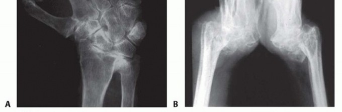 FIG 2 • A. PA radiograph of a rheumatoid wrist showing ulnocarpal translocation and radial deviation deformity. B. Lateral view of a rheumatoid wrist showing severe arthritis with volar subluxation of the carpus. Posttraumatic arthritis may develop years after an intraarticular distal radius fracture or fracture-dislocation of the carpus. In regard to implant arthroplasty, a malunion of the radius presents additional surgical challenges, but with proper planning and technique, a successful outcome is possible.SNAC and SLAC wrist conditions are the most common causes of nonrheumatoid wrist arthritis, often with predictable degenerative patterns but only modest deformity.