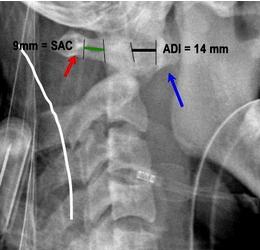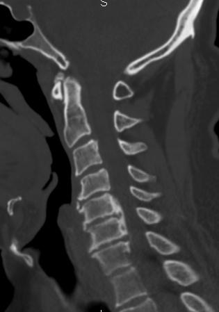 DISCUSSION: This patient has a spinal cord injury as a result of a rupture to his transverse ligament. This is evidenced by the increased atlanto dens interval on his computed tomography. Motor and sensory function are preserved below the neurological level, and at least half of key muscles below the neurological level have a muscle grade of 3 or more. His bulbocavernosus reflex is intact, so we know he is no longer in spinal shock. Therefore, he would be classified as an ASIA D.