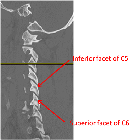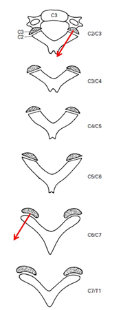 Pal et al., describe the orientation of the superior articular processes from C3 (posteromedial) through C7 (posterolateral). Illustration C demonstrates the orientation of the facets at each cervical level. The red arrow indicates facet orientation, the shaded region represents the superior articular process at each given level.