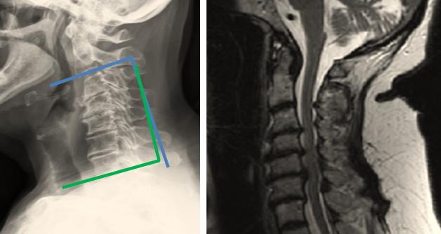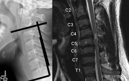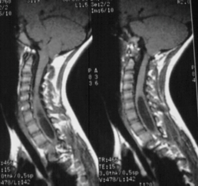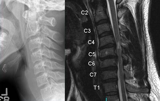 The imaging studies show a type II odontoid fracture, a congenital fusion at C2/3 and C4/5, and a large soft disc herniation at C3/4 with spinal cord compression and myelomalacia.