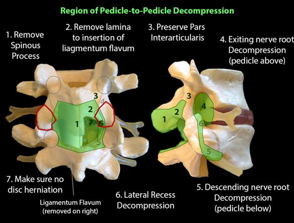 symptomatic spondylolysis, without listhesis or neurologic deficits, that has failed nonoperative management. Pain with single-limb standing lumbar extension is a characteristic physical finding with this condition. The oblique radiograph demonstrates a defect in the pars interarticularis. For comparison a radiograph of a normal lumbar spine is shown in Illustration A below. The oblique radiograph is often likened to a "Scotty dog". The parts of the dog are as follows: the transverse process-the nose; the pedicle-the eye; the pars interarticularis-the neck; the superior articular facet-the ear; the inferior articular facet-the front leg. The review article by Hu et al discusses surgical management of this condition. They argue at L4 and above treatment includes pars interarticularis repair whereas at L5-S1 treatment is in-situ fusion with bone grafting. A Gill procedure is a wide, bilateral decompression of the neural elements with removal of the loose lamina and is only indicated when the patient has signs of the neural compromise. Combined anterior/posterior fusion approaches are only a reasonable option in patients with spondylolisthesis.