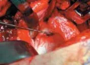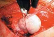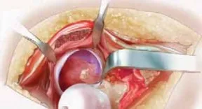 - إذا كان الجزء غير الكروي جانبيًا جدًا وخلفيًا جانبيًا، يُدفع الإزميل بعناية إلى الغضروف أو العظم، مستهدفًا نقطة الدخول المتوقعة للشرايين الشبكية الجانبية.