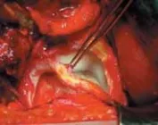 - الشكل التقني 7 • أ. صورة شعاعية قبل الجراحة لمريض يعاني من حُق عميق. ب. منظر بعد الجراحة لنفس المريض بعد الفصل المحيطي للشفا وتشذيب الحُق. أعيد تثبيت الشفا بثماني مراس عظمية. أعيد تثبيت المدور *