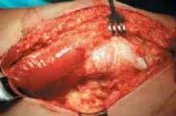 - يُقطع النسيج تحت الجلد، باستخدام إرقاء دقيق، وصولاً إلى الشريان الحرقفي الظنبوبي واللفافة فوق العضلة الألوية الكبرى.