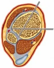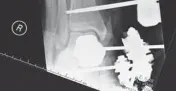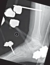 - يتم وضع مسمار تثبيت عرضي ثانٍ عبر حديبة العقب، على غرار الإطار الذي يمتد عبر الكاحل الموصوف أعلاه.