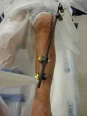 - شكل 6 • تُرفع الطرف المصابة باستخدام دعامة أو وسادة وضعية المريض (beanbag) توضع تحت الورك في نفس الجانب. وهذا يسمح برؤية الساق المصابة دون تداخل من الساق المقابلة "السفلى". تُستخدم دعامة معقمة لدعم الكاحل، مما يسمح بالوصول بزاوية 360 درجة ورؤية الظنبوب المصاب وتوفير مساحة لأي تكوين مثبت ضروري. *