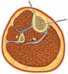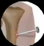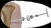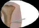 - بدلاً من ذلك، يمكن وضع هذا المسمار في الجزء البعيد من عظم الفخذ عند مستوى منتصف الرضفة على طول اللقمة الوحشية الوسطى لعظم الفخذ.
