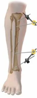 - تسمح التشريح العرضي لجسم العظم (الديافيزي) والموقع الجانبي للأحياز العضلية بوضع نصف المسامير في مجموعة واسعة من المواقع تحت الجلد. وهذا يسهل وضع المسامير "خارج المستوى" لبعضها البعض، مما يساعد على تحقيق الاستقرار الكلي للإطار (شكل 2).