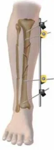 - التمييز هنا بين التثبيت الخارجي أحادي الجانب (قضبان توصيل طولية) والتثبيت الخارجي الدائري (أسلاك تتصل بحلقات).