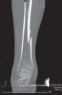 - يجب الحصول على فحوصات الأشعة المقطعية بالشد بعد تطبيق المثبت الذي يمتد عبر الركبة أو الكاحل. تشير هذه الدراسات إلى فعالية رد الشد الرباطي (ligamentotaxis). وهذا يسمح للجراح بتحديد الخطة الجراحية قبل العملية للتثبيت النهائي بمجرد تعافي الأنسجة الرخوة (شكل 5).