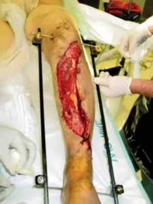- شكل 3 • مريض متعدد الإصابات يعاني من مثبتات ظنبوبية مؤقتة ثنائية الجانب. يمتد التثبيت الخارجي على الجانب الأيمن لكسر مفتوح في جسم الظنبوب مع إصابة في مقدمة القدم في نفس الجانب. تم تثبيت الساق اليسرى ومنطقة الكاحل بإطار مثلثي مؤقت. *
