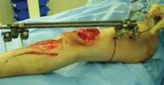 - تشمل دواعي استخدام التثبيت الخارجي لجسم عظم الساق في تطبيقات الرضوض علاج الكسور المفتوحة المصحوبة بتلف واسع للأنسجة الرخوة وتلوث. وتشمل الدواعي الأخرى تثبيت الكسور المغلقة المصحوبة بإصابة شديدة في الأنسجة الرخوة أو متلازمة الحيز.