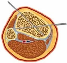 - يتم وضع مسمارين شانز في منطقة منتصف جسم الظنبوب (شكل تقني 6).