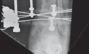 - تتكون العدوى الشديدة في مسار المسمار من تصريف مصلي أو قيحي مصلي بالتزامن مع احمرار، والتهاب، وصور شعاعية تظهر تحلل العظم في كل من القشرة القريبة والبعيدة.
