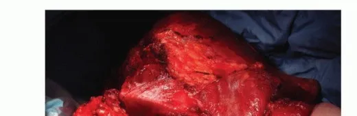 الشكل الفني 7 • أ. رسم توضيحي يوضح جدار الصدر المكشوف والسدائل الجلدية اللفافية المتبقية بعد بتر الربع الأمامي. ب، ج. صور فوتوغرافية أثناء الجراحة تُظهر تحريك السديلة الخلفية الكبيرة إلى الأمام فوق جدار الصدر.