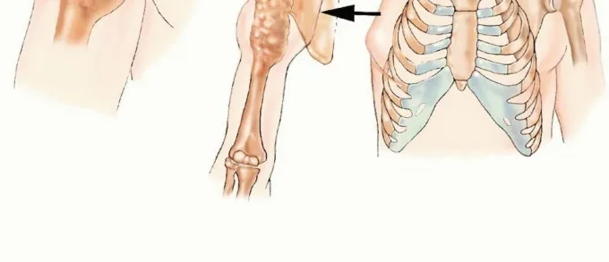 - ورم كبير في الأنسجة الرخوة حول الجزء القريب من الذراع/الإبط مع انحباس وتضرر حزمة الأوعية العصبية وامتداد عبر المفصل (الشكل 2). *