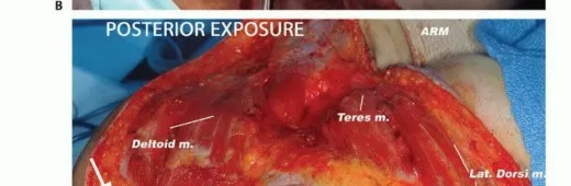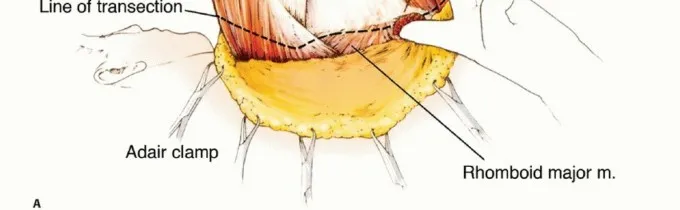 - يُستخدم النهج الخلفي لفصل لوح الكتف عن العضلات المعينية، شبه المنحرفة، الرافعة للكتف، والظهرية العريضة (الشكل الفني 3). *