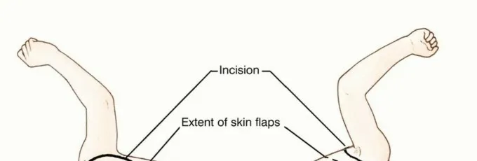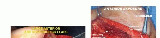 الشكل الفني 1 • أ. يبدأ الجزء الأمامي من الشق فوق الترقوة بحوالي 2 سم وحشيًا للمفصل القصي الترقوي. نحو الأسفل، يقع خط الشق في التلم الدالي الصدري أو بالقرب منه؛ نحو الأعلى، يعبر خط الشق طرف الناتئ الأخرمي. صور فوتوغرافية أثناء الجراحة تُظهر ذراعي الشق الأمامية (ب) والخلفية (ج). تلتقي هاتان الخطتان أسفل الإبط لتشمل الجلد الذي يحمل شعر الإبط. (يتبع)