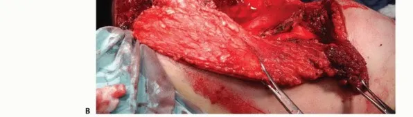 الشكل الفني 2 • يتم إجراء معظم عملية بتر الربع الأمامي من الأمام. أ، ب. تُرفع السديلة الأمامية، مما يكشف عن الترقوة، الأخرم، ومنشأ العضلة الصدرية الكبرى فوقها. (يتبع)