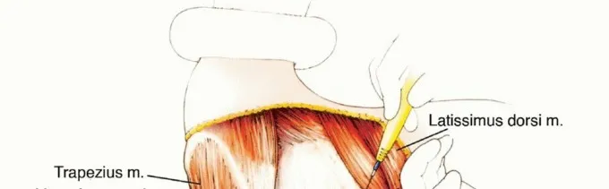 - يبدأ الجزء الأمامي من الشق فوق الترقوة بحوالي 2 سم وحشيًا للمفصل القصي الترقوي. نحو الأسفل، يقع خط الشق في التلم الدالي الصدري أو بالقرب منه؛ نحو الأعلى، يعبر طرف الناتئ الأخرمي. *