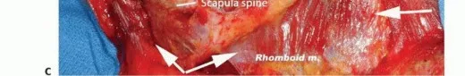 الشكل الفني 3 • أ-ج. فصل ارتباطات لوح الكتف للعضلات المعينية، شبه المنحرفة، رافعة الكتف، والظهرية العريضة. (يتبع)