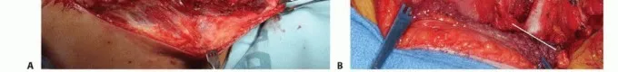- يُجرى استكشاف وعائي أمامي عن طريق فصل العضلة الصدرية الكبرى عن الترقوة. يُجرى قطع عظم الترقوة عند الثلث القريب، ويُحدد موقع الضفيرة العضدية والأوعية تحت الترقوية الكامنة (الشكل الفني 2). يمكن وضع ملقط ساتينسكي عاليًا على طول الأوعية، ثم يمكن للجراحة أن تستمر كما هو مخطط لها. *