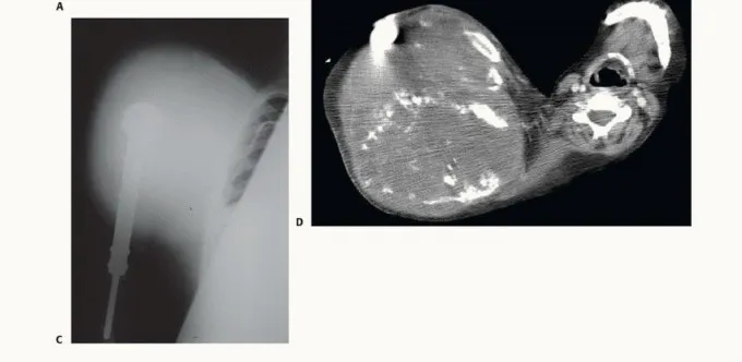 الشكل 3 • أ. رسم توضيحي يظهر ساركوما عالية الدرجة في العضد القريب مع امتداد الورم عبر المفصل وحول لوح الكتف. ب. صورة فوتوغرافية أثناء الجراحة لمريض يبلغ من العمر 15 عامًا تم تشخيصه بساركوما إوينغ في العضد القريب وعولج بالعلاج الكيميائي والإشعاعي قبل الجراحة. نما الورم بشكل كبير على الرغم من العلاج، مما تسبب في تدمير واسع للعظم وامتداد إلى الأنسجة الرخوة المحيطة كما يتضح من (ج) الصورة الشعاعية البسيطة و (د) التصوير المقطعي المحوسب.