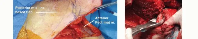 - تُنشأ السديلة الجلدية الأمامية، التي يمكن تمديدها إلى منتصف القص، أولاً، مع وقوف الجراح أمام المريض. ثم يغير الجراح وضعيته ليقف خلف المريض وينشئ السديلة الخلفية إلى الحافة الإنسية للوح الكتف. *