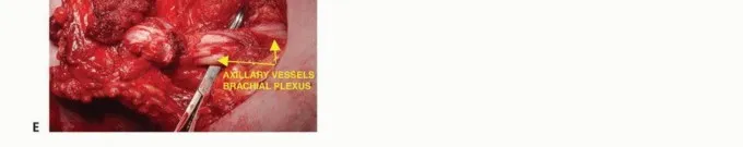- تمر الأوعية الإبطية والجزء تحت الترقوي من الضفيرة العضدية مباشرة أسفل الناتئ الغرابي، الذي يمكن جسّه بسهولة، وتقع تحت اللفافة الدالية الصدرية. يجب تقييم هذه الهياكل قبل الجراحة لتحديد الجزء الذي يمكن قطعه وربطه بأمان، خاصة وأن الأورام الكبيرة قد تقترب من المخرج الصدري. *