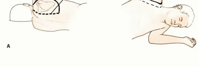 الشكل 5 • أ. يوضع المريض في وضعية جانبية كاملة ويُثبت على طاولة العمليات عند الوركين بشريط لاصق. بدلاً من ذلك، يمكن استخدام حزمة VAC لتثبيت الجذع. توضع دعامة إبطية تحت الإبط للسماح بحركة كاملة للصدر، وتوضع وسادة إسفنجية مطاطية تحت الورك لمنع تلف الجلد الناتج عن نقص التروية في هذه المنطقة. يجهز الجلد، ويغطى الطرف المصاب بالورم بحرية. ب، ج. وضعية مريضة تبلغ من العمر 35 عامًا مصابة بساركوما متكررة في الإبط. لاحظ الندبة من الجراحة السابقة في التلم الدالي الصدري.