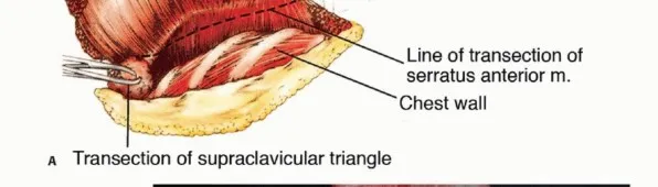 - يُرفع لوح الكتف عن جدار الصدر بفصل العضلة المنشارية الأمامية عن صفيحتها الداخلية والعضلة الظهرية العريضة عند أدنى نقطة لها (الشكل الفني 4). *