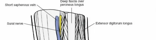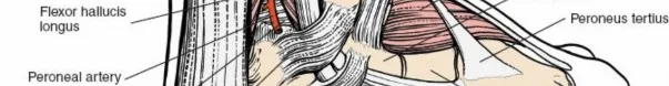 شكل 12-65: تم استئصال وتر العرقوب وعضلات الشظية للكشف عن الجانب الخلفي الوحشي لمفصل الكاحل والأوتار العميقة القابضة للقدم. يقع وتر قابضة إبهام القدم الطويلة مباشرة إلى الإنسي من العضلة الشظوية القصيرة. اللفافة التي تغلف هذه العضلات عميقة بالنسبة للفافة العميقة؛ وهي تفصلها إلى حجرات شظوية وحجرات قابضة عميقة. وتبقى عضلة قابضة إبهام القدم الطويلة عضلية حتى مفصل الكاحل.