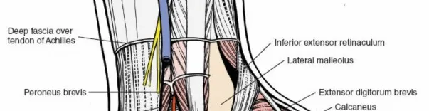 شكل 12-64: التشريح السطحي للجانب الخلفي الوحشي للقدم والكاحل. لاحظ أن الألياف العضلية للعضلة الشظوية القصيرة تمتد على طول الطريق إلى مفصل الكاحل وتقع مباشرة خلف الكعب الوحشي.
