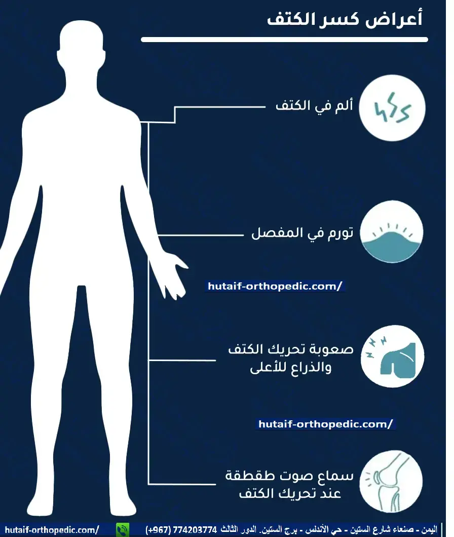 عند إصابتك بكسر في أحد عظام الكتف سوف تلاحظ علامات وأعراض من أهمها الألم الذي يمنعك من تحريك كتفك بسلاسة كما قد يظهر تورم حول مفصل كتفك بالإضافة إلى أنك قد تسمع صوت فرقعة عظمية عند قيامك بتحريك المفصل.
